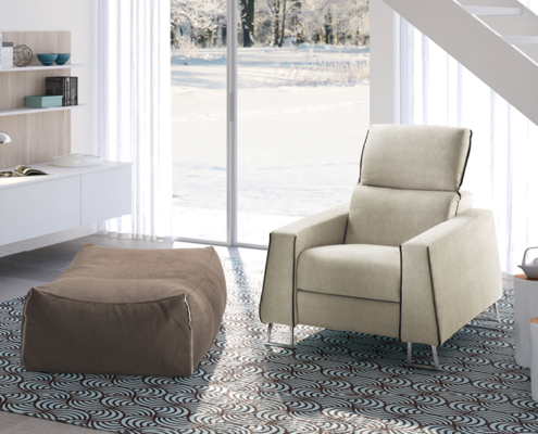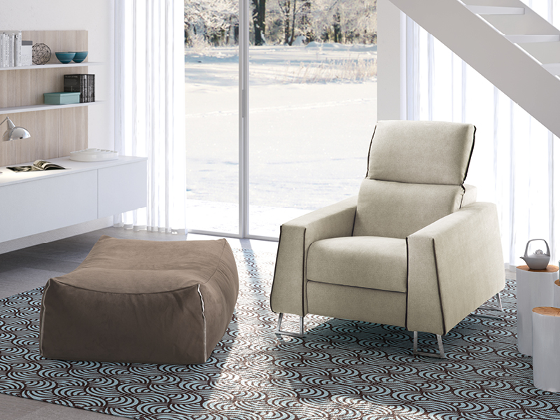 Versioni: poltroncina fissa – poltrona fissa/recliner – laterale 1 posto dx-sx fisso/recliner – centrale 1 posto fisso/recliner – penisola dx-sx – pouff rettangolare – pouff “sacco” rettangolare – pouff “sacco” quadrato