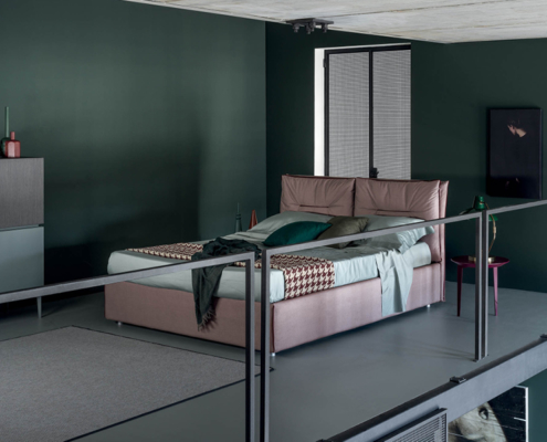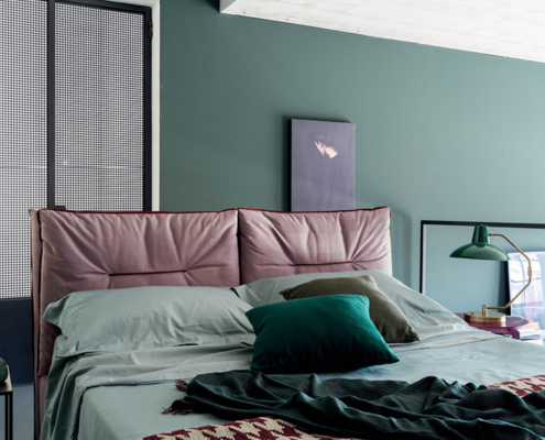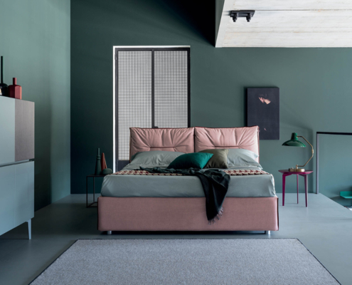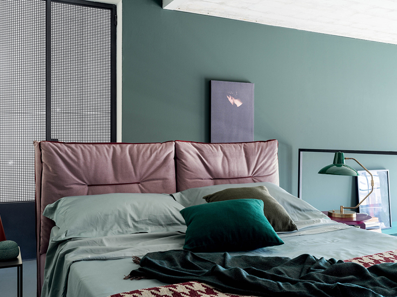 Letto dalle linee morbide ed avvolgenti con testiera trapuntata e di design.