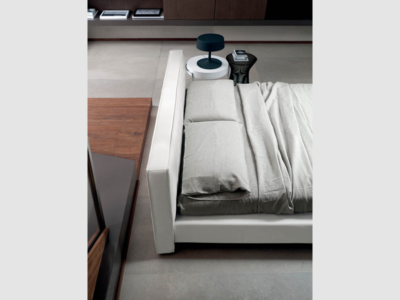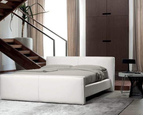 Letto moderno dalla linea squadrata ed elegante, dotato a richiesta di pediera alta che ricorda un po’ i letti di un tempo.