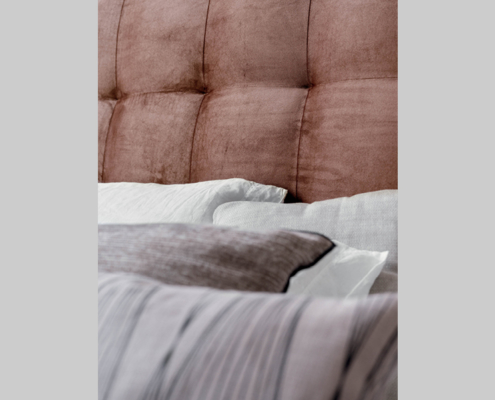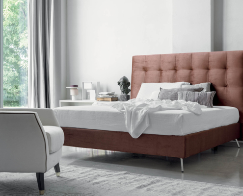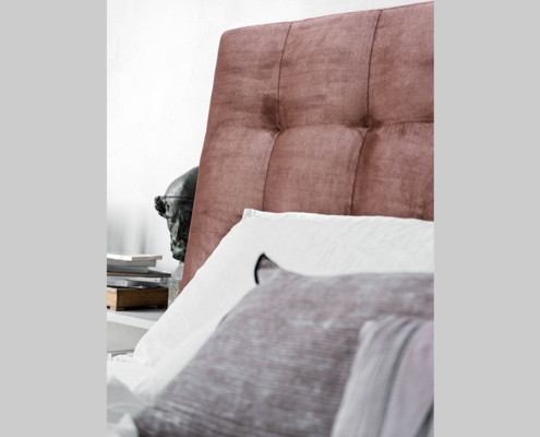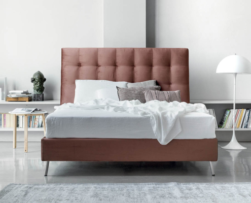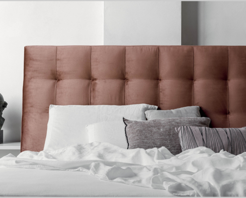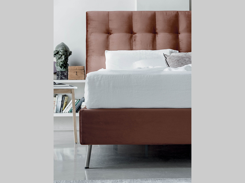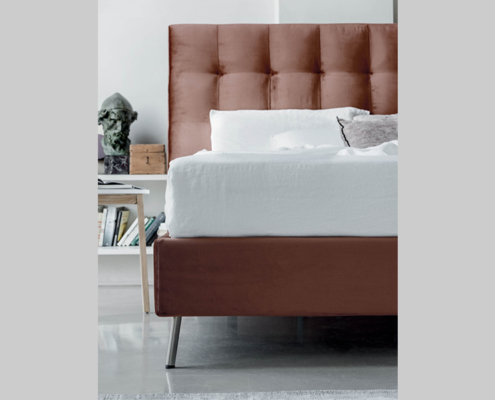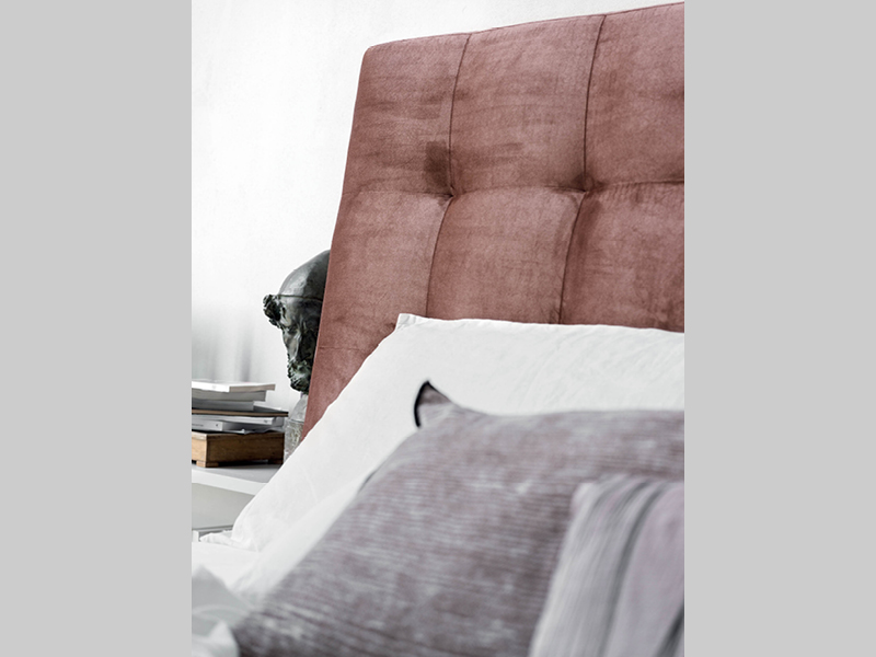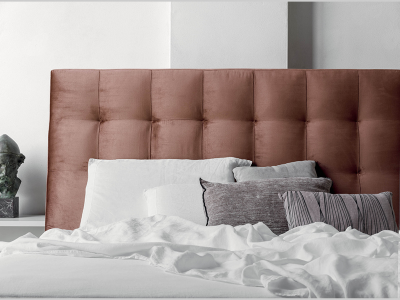 Letto caratterizzato dall’alta testiera composta da moduli quadrati che creano un pannello che decora la parete.