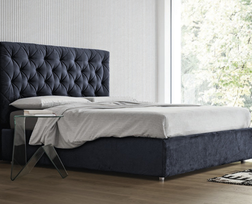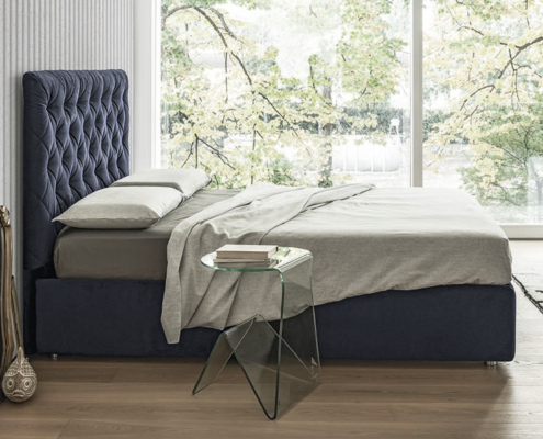Letto con testiera dalla ricca impuntura che la impreziosisce e la rende originale e accattivante.